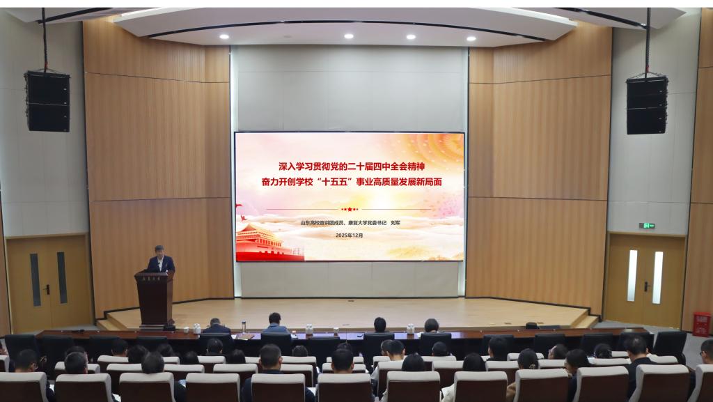 12月18日上午,学校在行政楼报告厅举行党的二十届四中全会精神宣讲报告会。山东省高校宣讲团成员、学校党委书记刘军以“深入学习贯彻党的二十届四中全会精神 奋力开创学校‘十五五’事业高质量发展新局面”为题作主旨报告。学校领导班子成员、管理干部及教师代表近200人现场聆听。